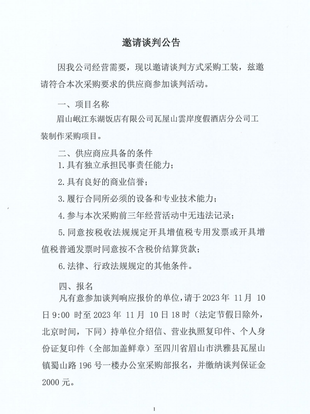 眉山岷江東湖飯店有限公司瓦屋山雲(yún)岸度假酒店分公司工裝制作采購項目